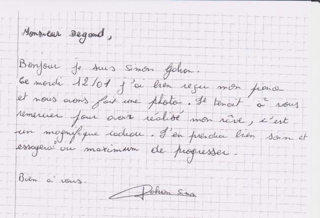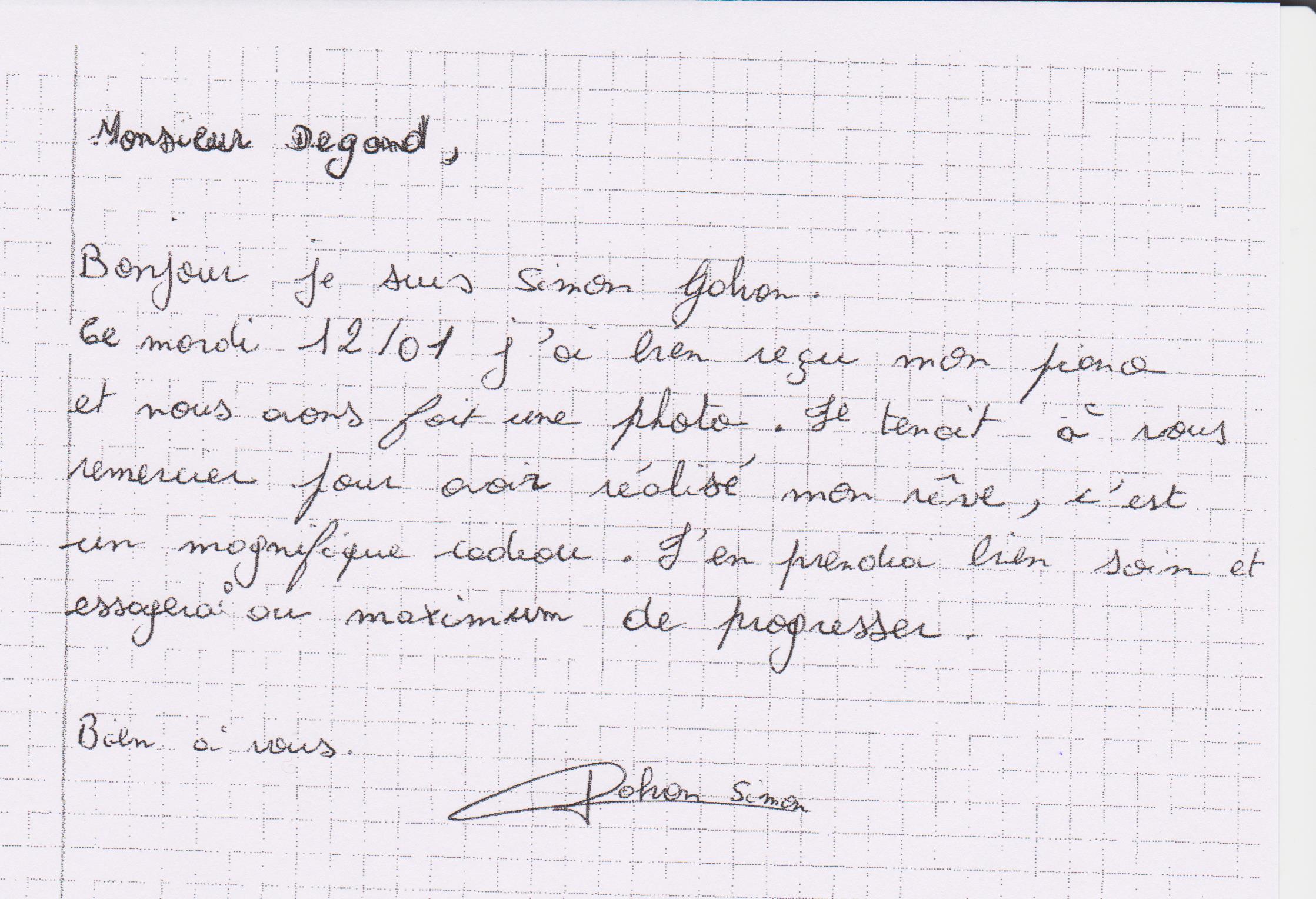 "Nous tenons à vous remercier pour ce magnifique cadeau que votre association a offert si rapidement et si généreusement à notre enfant Simon suite à notre demande. Cela nous touche beaucoup et nous pouvons vous assurer qu’autant Simon passe tous les jours du temps à y jouer, autant cela nous procure de la joie de le voir et de l’entendre y prendre du plaisir. C’est d’ailleurs également une grande surprise pour tous ceux qui viennent à la maison."